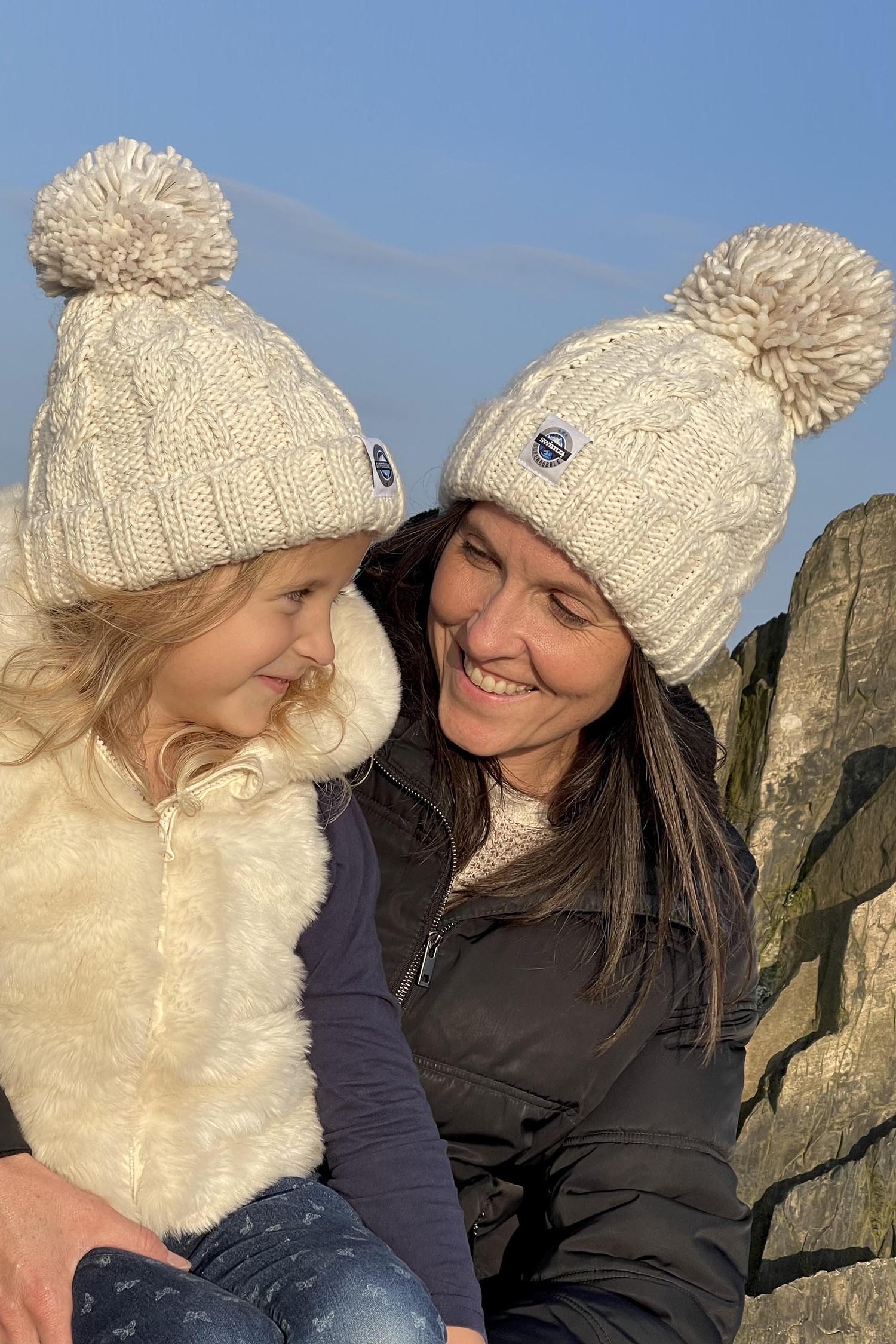 Unisex Adult and Child cable knit design SuperBobble hat bundle with reflective yarns throughout with a luxury sherpa fleece lining.