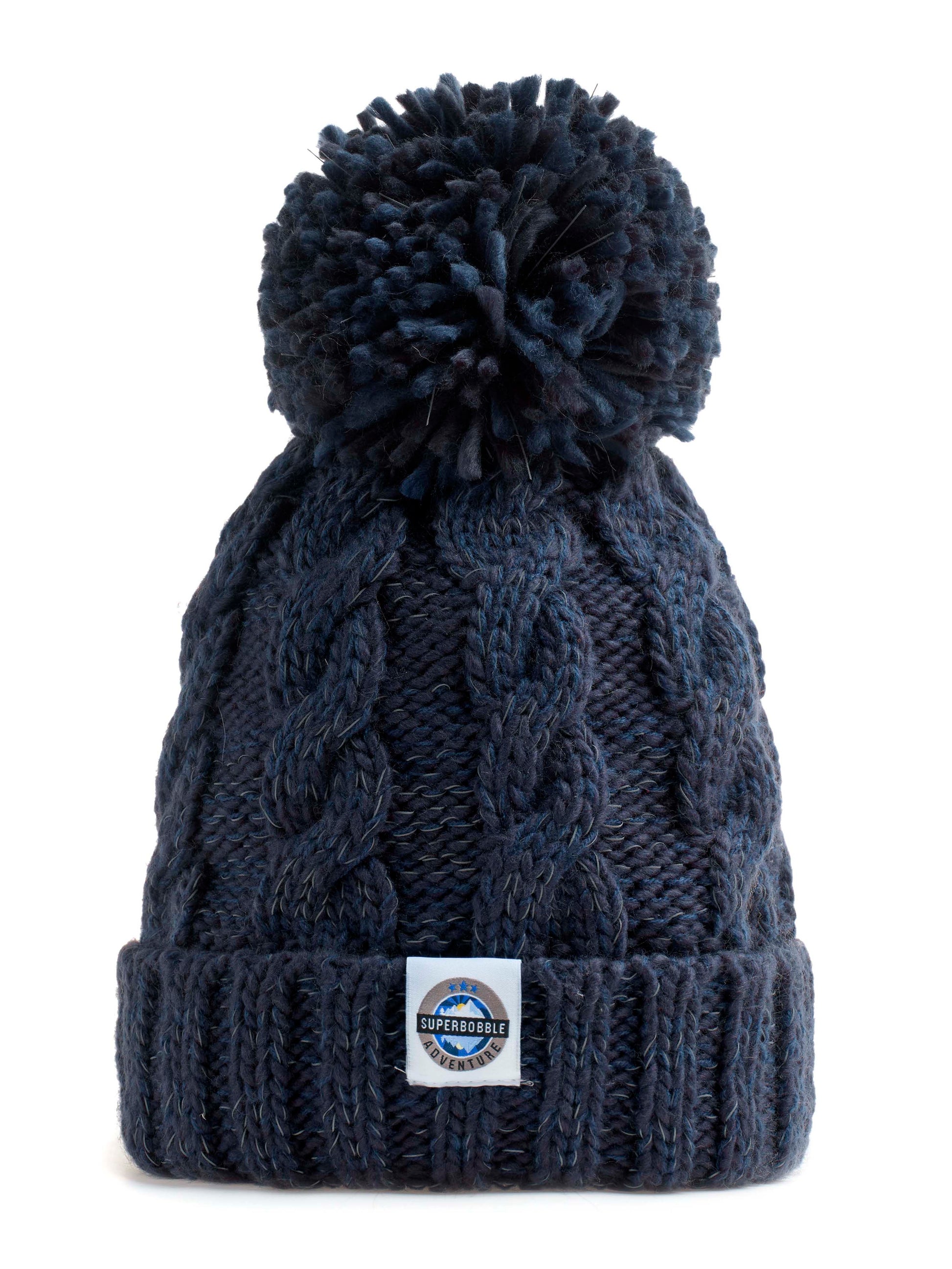 The Deep Navy Cable is one of our most popular colours and styles of SuperBobble Hat designs; it’s the epitome of comfort, warmth, and style. Crafted with the finest materials, this hat features a luxurious sherpa lining, providing an unparalleled softness and insulation against the cold with the added benefit of reflective yarn throughout. The exterior boasts a classic bobble design, adding a playful touch to its practicality. Whether you're hitting the slopes, dog walking or strolling through the city streets, the SuperBobble bobble hat ensures you stay cozy and chic wherever you go.