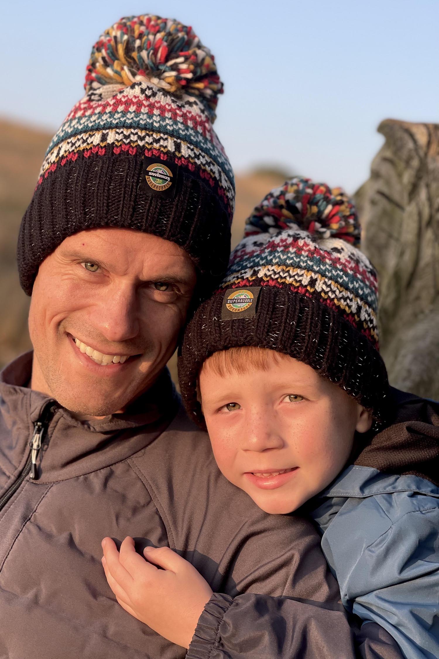Unisex Nordic knit design Adult & Child SuperBobble hat bundle with reflective yarns to headband and pom-pom with a luxury sherpa fleece lining. Our Nordic design is a SuperBobble favorite. This striking jet black, deep red, fjord blue and cream features a traditional pattern from the far north of mainland Europe. The SuperBobble bobble hat is not your average winter accessory; it’s the epitome of comfort, warmth, and style. Crafted with the finest materials, this hat features a luxurious sherpa lining, providing an unparalleled softness and insulation against the cold with the added benefit of reflective yarn to the headband and pom pom. The exterior boasts a classic bobble design, adding a playful touch to its practicality. Whether you're hitting the slopes, dog walking or strolling through the city streets, the SuperBobble bobble hat ensures you stay cozy and chic wherever you go.