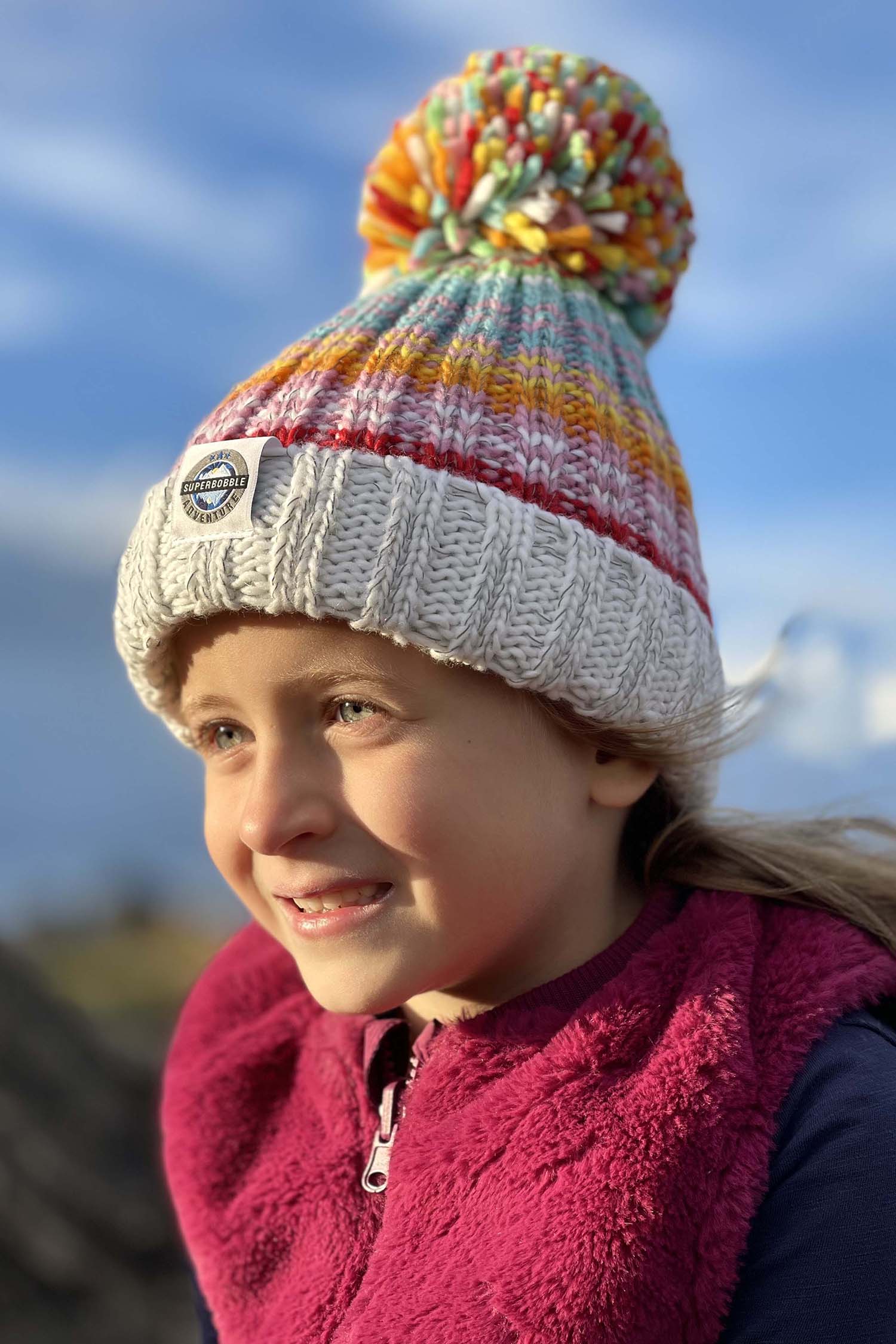 Unisex kids rib knit design superbobble hat with reflective yarns to headband and pom-pom with a luxury sherpa fleece lining. Our Rib design is a Superbobble favorite. This striking multi colours with cream base features a contemporary pattern from the far north of mainland Europe. The SuperBobble bobble hat is not your average winter accessory; it’s the epitome of comfort, warmth, and style. Crafted with the finest materials, this hat features a luxurious sherpa lining, providing an unparalleled softness and insulation against the cold with the added benifit of reflective yarn to the headband and pom pom. The exterior boasts a classic bobble design, adding a playful touch to its practicality. Whether you're hitting the slopes, dog walking or strolling through the city streets, the Superbobble bobble hat ensures you stay cozy and chic wherever you go. • Traditional Rib knit • Headband relaxed, elasticated to comfortably fit ages 4-8yrs.